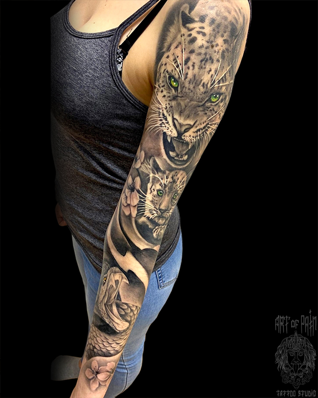 Татуировка женская реализм тату-рукав ягуар с котенком и змея 6895