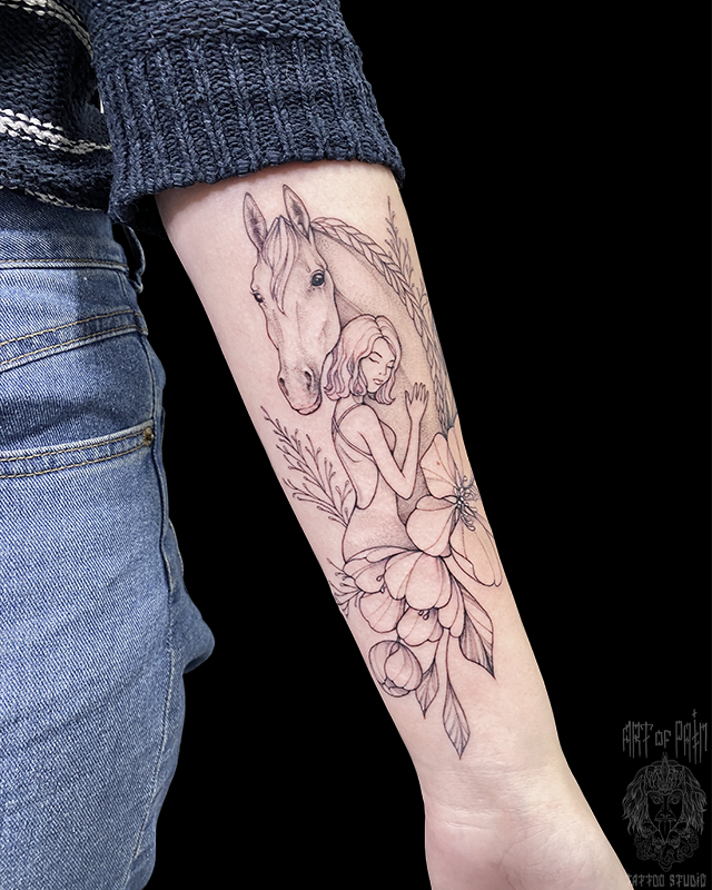 Татуировка женская графика на предплечье лошадь и девушка 6990