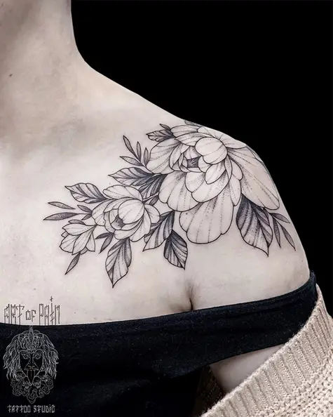 Татуировка женская графика на ключице и плече цветы (Мария Котова) 6998