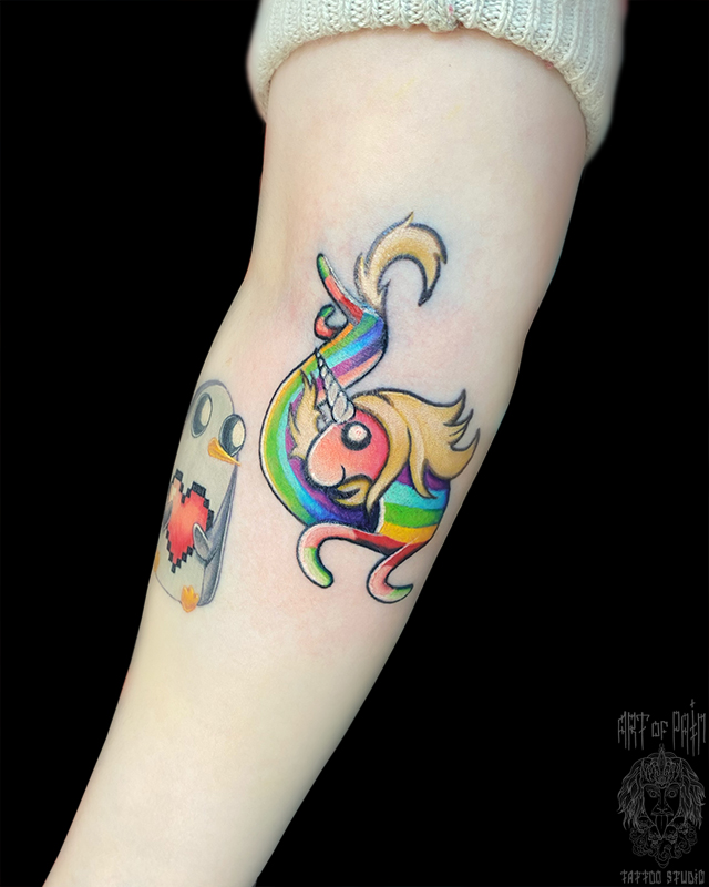 Татуировка женская нью скул на предплечье единорог 7030