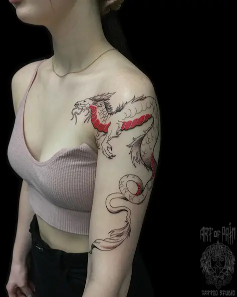 Татуировка женская графика на плече и ключице дракон (вид сбоку) 7067