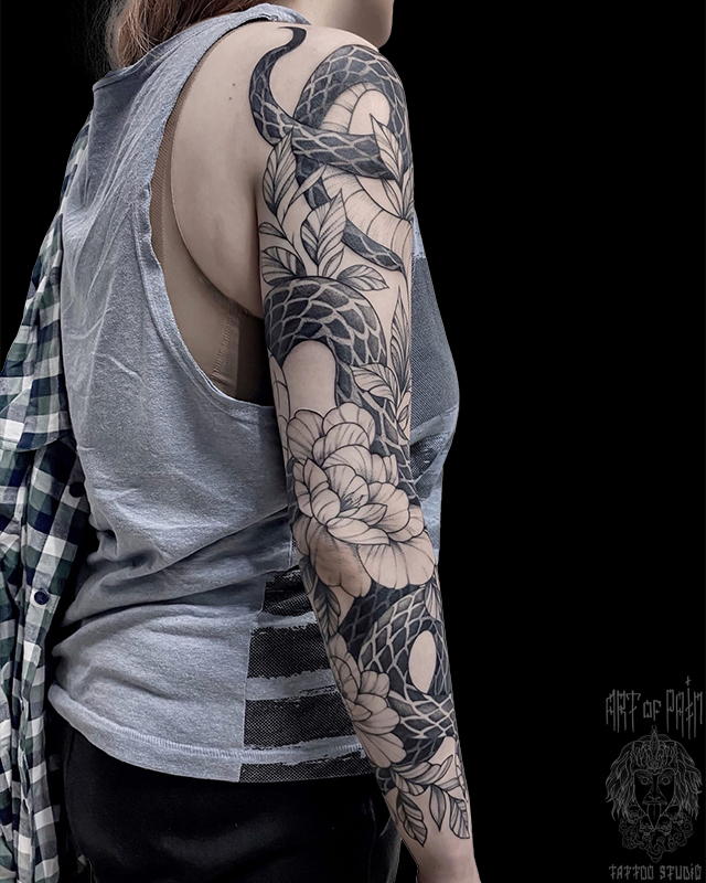 Татуировка женская япония, графика тату-рукав змея и цветы (вид сбоку) (Мария Котова) 7097