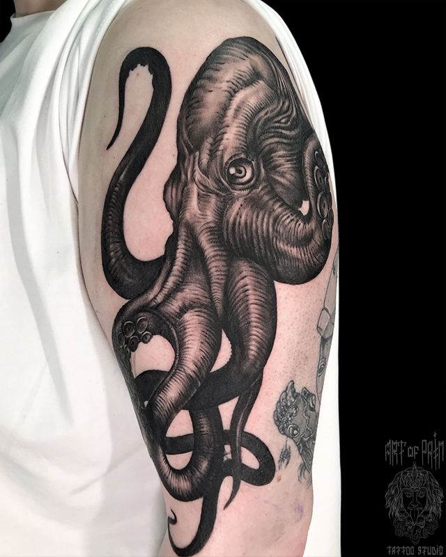 Татуировка женская нью скул на плече реализм осьминог 7121