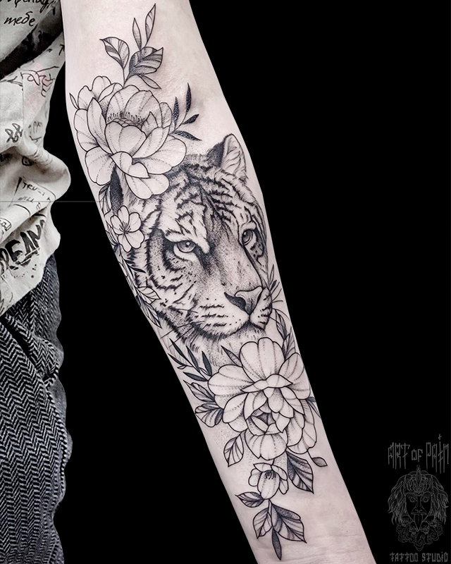 Татуировка женская графика на предплечье тигр и цветы (Мария Котова) 7132