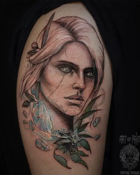 Татуировка женская графика на плече девушка и морда тигра 7154