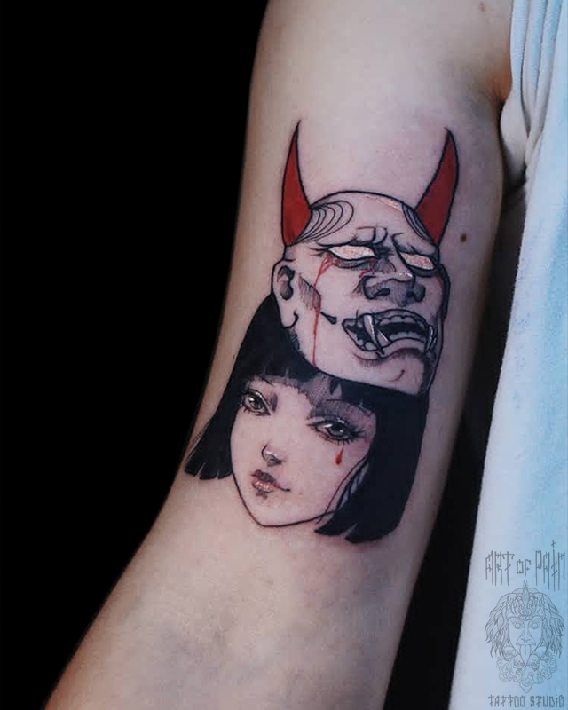 Татуировка женская графика на руке девушка и маска 7159