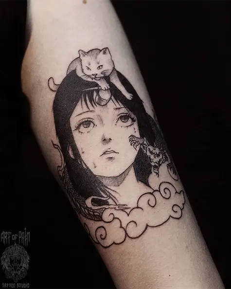 Татуировка женская графика на руке девушка, котик, дракон 7168