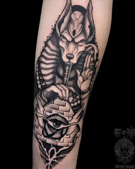 Татуировка женская графика на предплечье Анубис, всевидящее око 7173