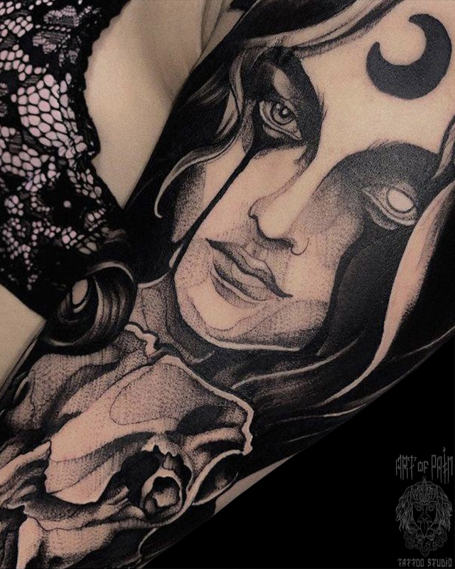 Татуировка женская нью скул на плече девушка и череп 7174