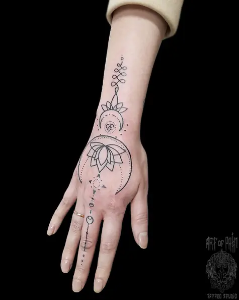 Татуировка женская графика на кисти лотос и узор (Николай Орф) 7185