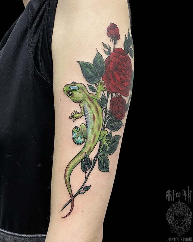 Татуировка женская нью скул на плече роза и ящерица (Анастасия Родина) 7200