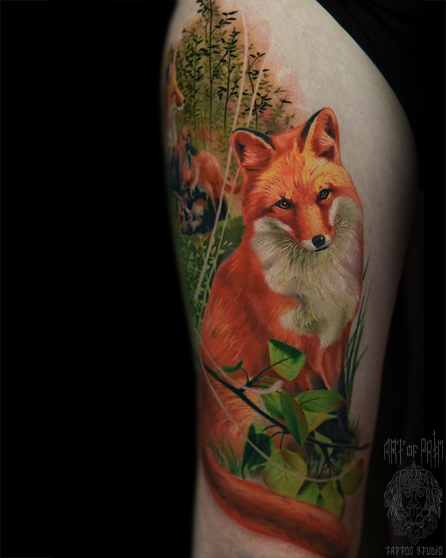 Татуировка женская реализм на бедре лисы в лесу 7263