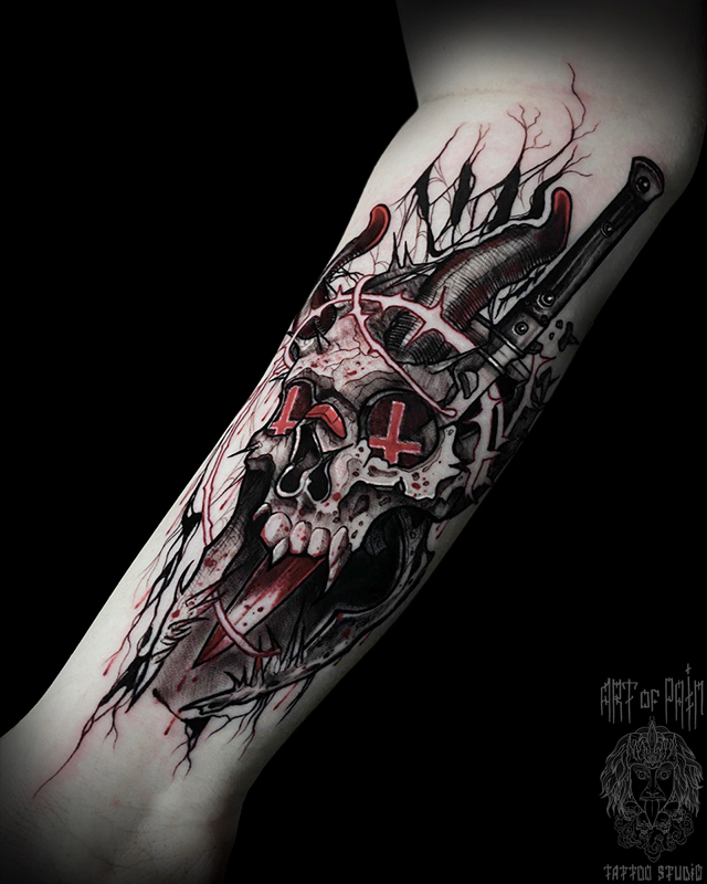 Татуировка женская хоррор и графика на предплечье с черепом (Кирилл Плотников) 7389