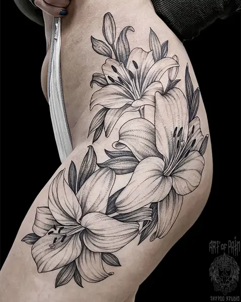 Татуировка женская графика на бедре большие лилии (Мария Котова) 7410