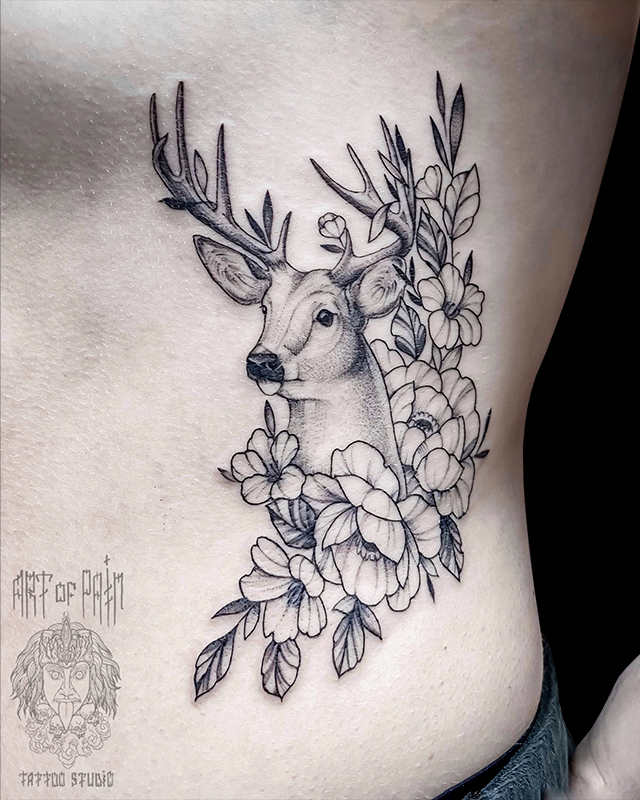 Татуировка женская графика на боку олень (Мария Котова) 7412