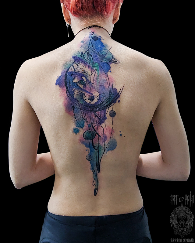 Татуировка женская акварель на спине лиса и планеты (Анастасия Родина) 7419