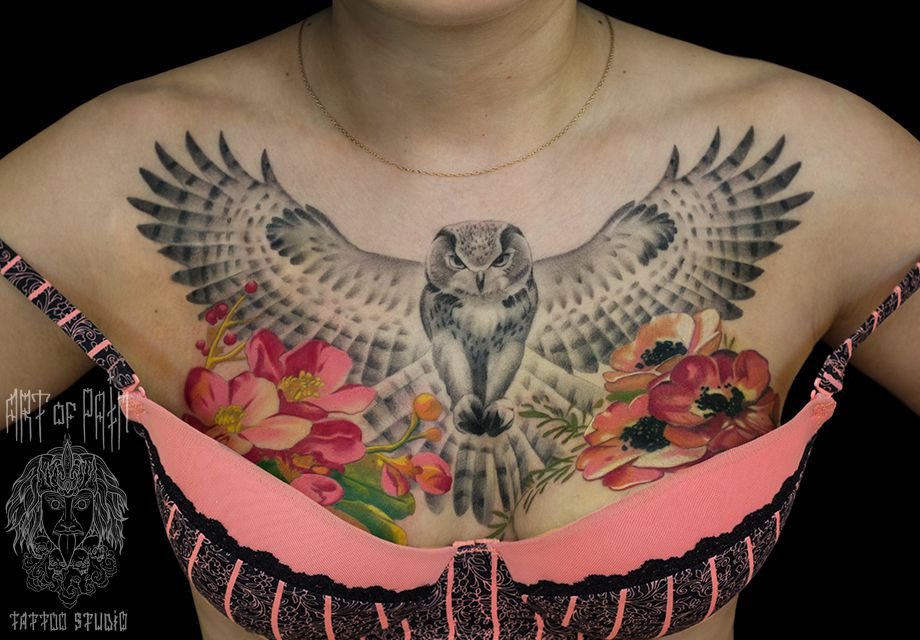 Татуировка женская реализм на груди сова 745