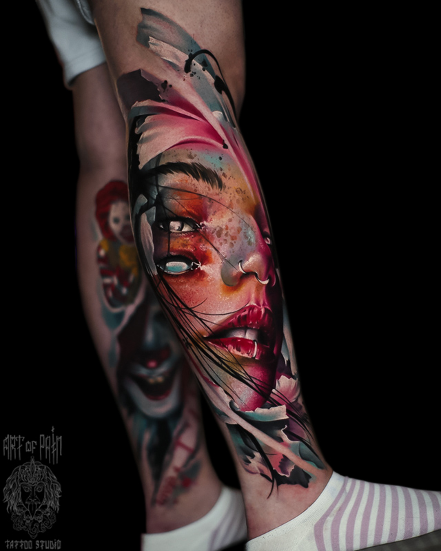 Татуировка женская реализм на голени девушка (Дмитрий Шейб) 7462