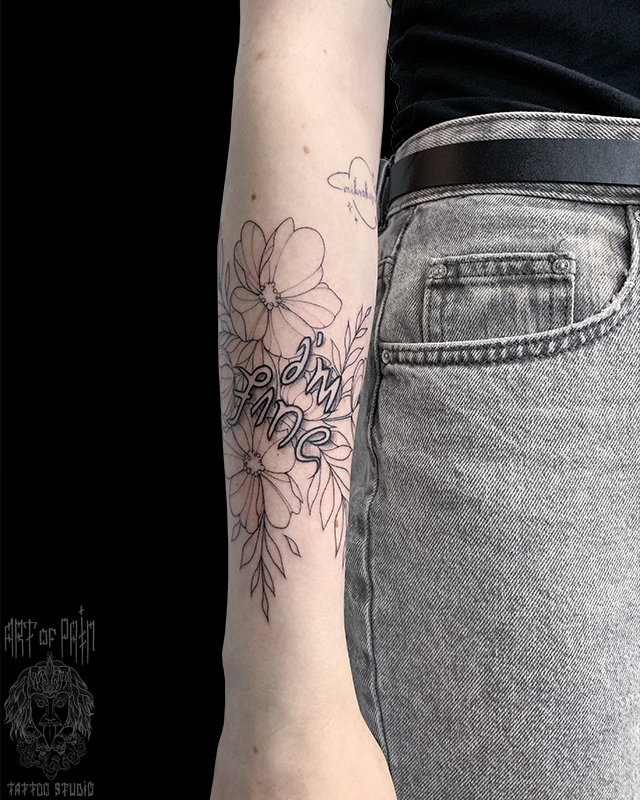 Татуировка женская графика на предплечье цветы и надпись 7618