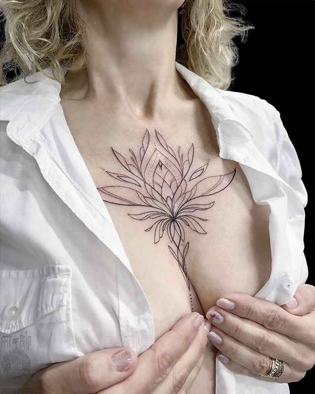 Татуировка женская графика на груди лотос 7623