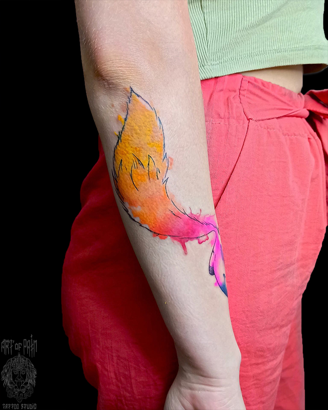 Татуировка женская акварель на предплечье лиса (хвост) 7646
