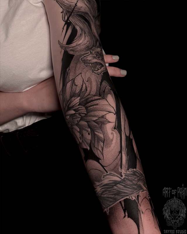 Татуировка женская нео-япония на предплечье Кицунэ и пион (Денис Марченко) 7665