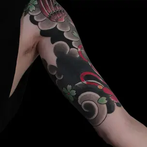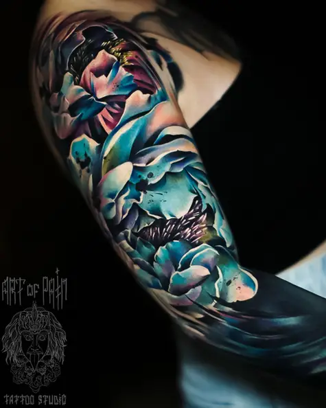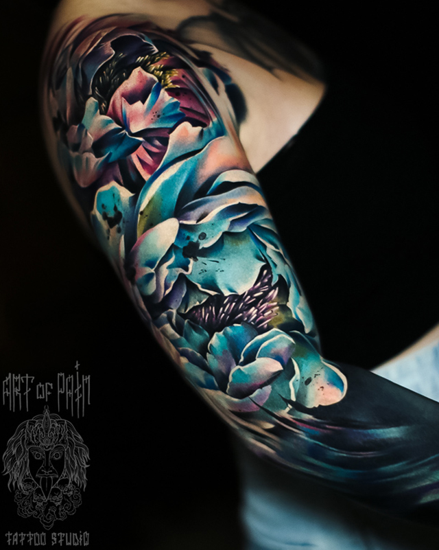 Татуировка женская реализм на плече пионы (Дмитрий Шейб) 7678