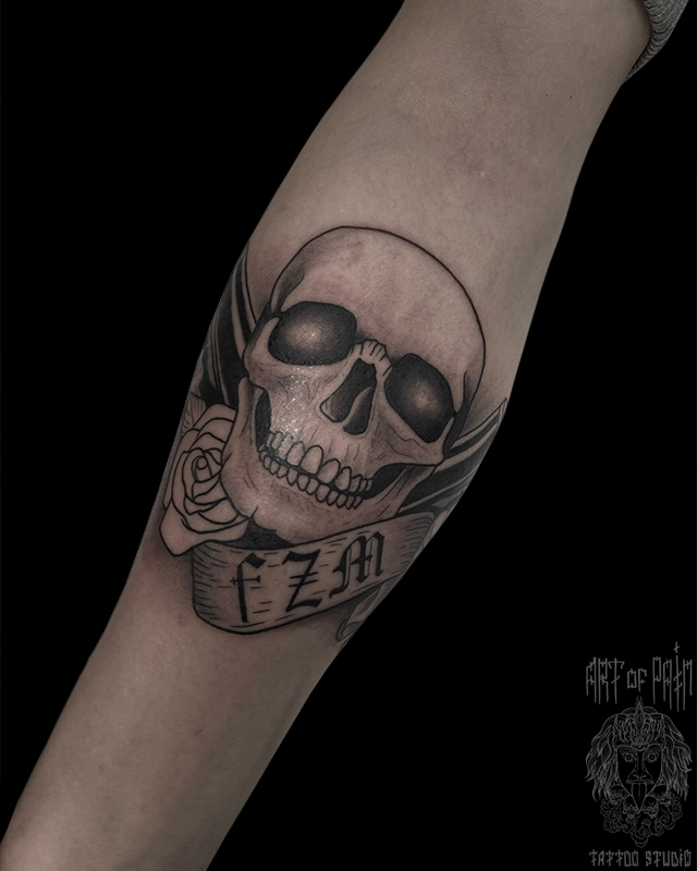 Татуировка женская графика на предплечье череп 7792
