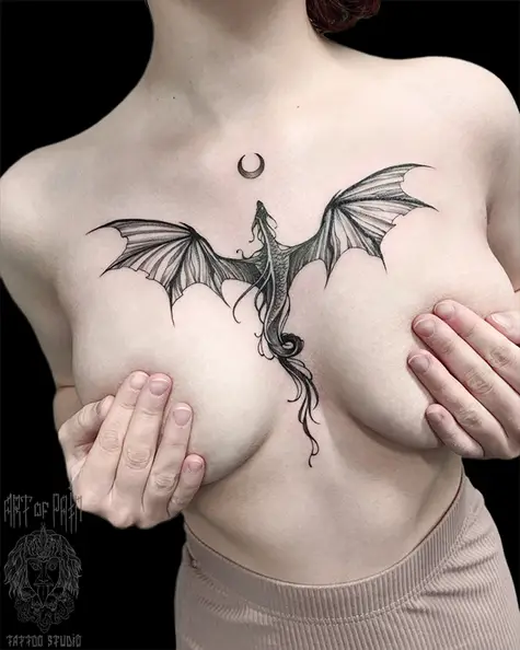 Татуировка женская графика на груди дракон 7841