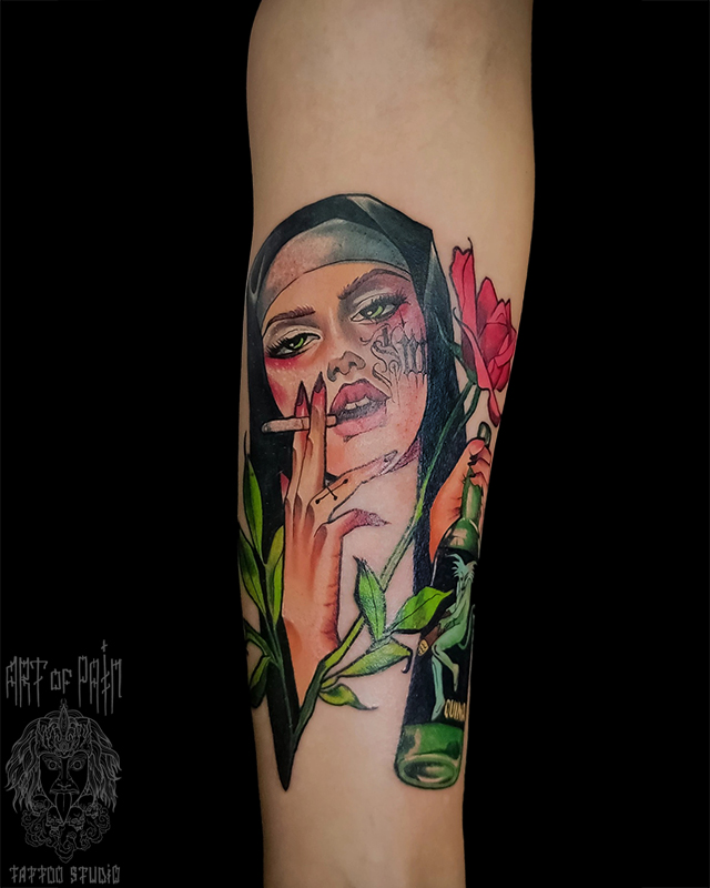 Татуировка женская нью-скул на предплечье девушка-монашка (Евгений Кузьменков) 7855