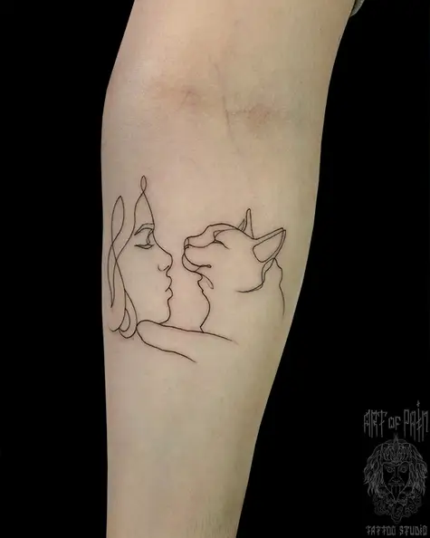 Татуировка женская графика на предплечье кот и девушка 7866