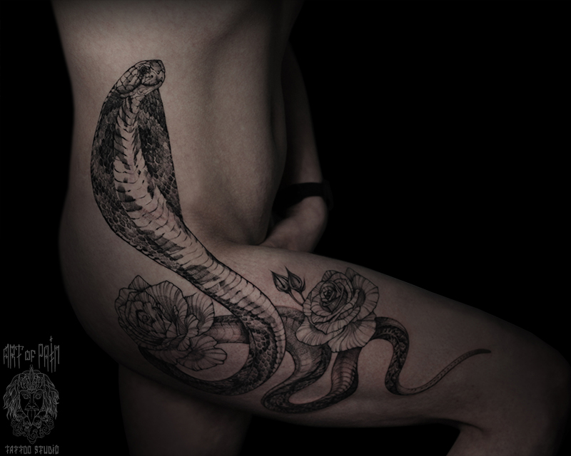 Татуировка женская графика на бедре змея и розы (Надежда Полякова) 7886