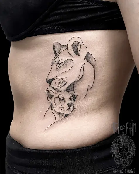 Татуировка женская графика на боку львица со львенком (Мария Котова) 7933