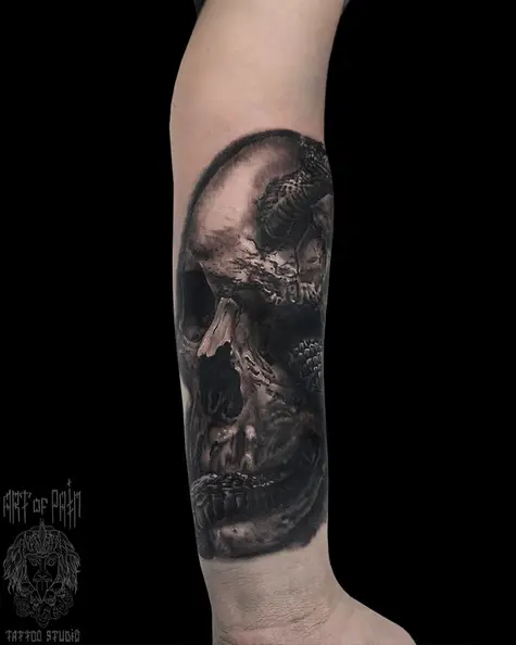 Татуировка женская реализм на предплечье череп и змея (Евгений Кузьменков) 7986