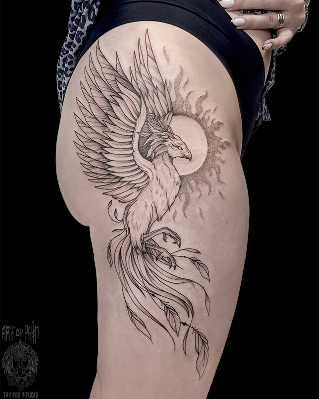 Татуировка женская графика на бедре феникс (Мария Котова) 7989