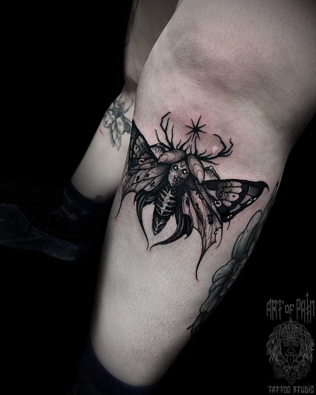 Татуировка женская графика, хоррор на голени мотыль (Кирилл Плотников) 7997
