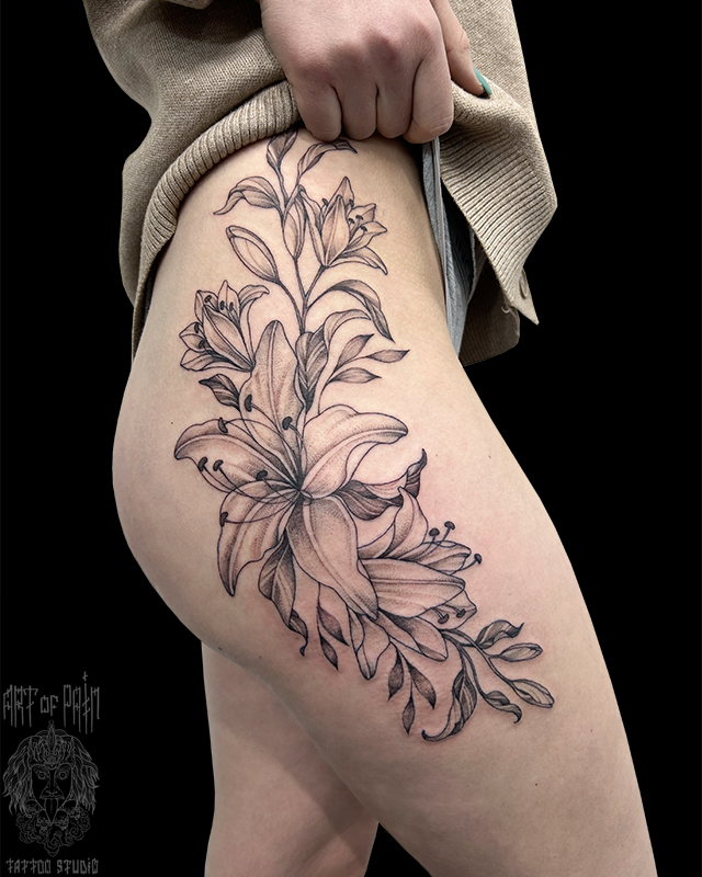 Татуировка женская графика на бедре цветы лилии 8026