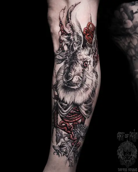 Татуировка женская реализм на голени Белый Кролик (Слава Tech Lunatic) 8039