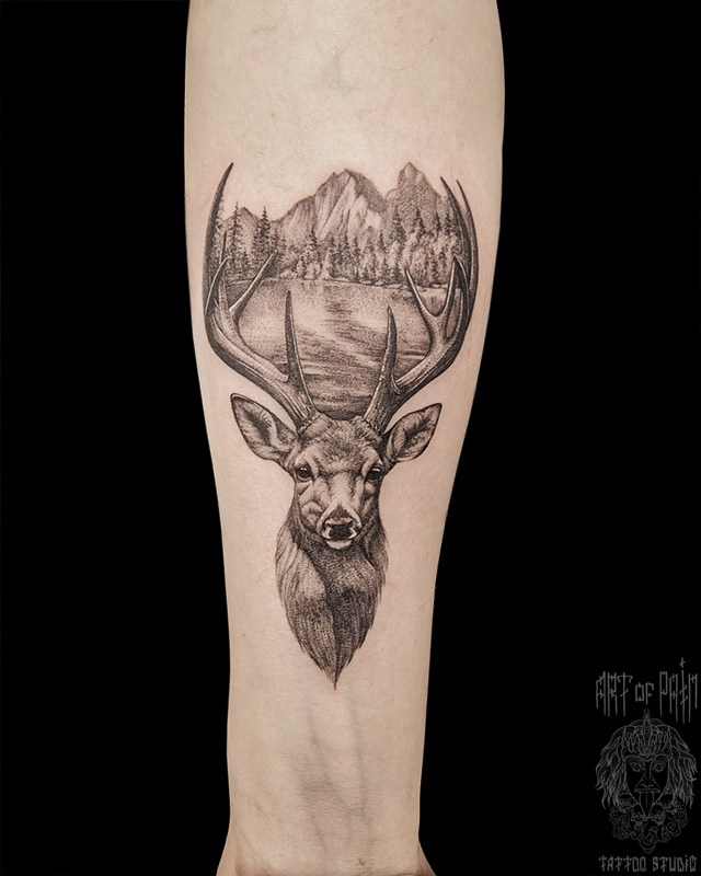Татуировка женская графика на предплечье олень и пейзаж (Анастасия Родина) 8045