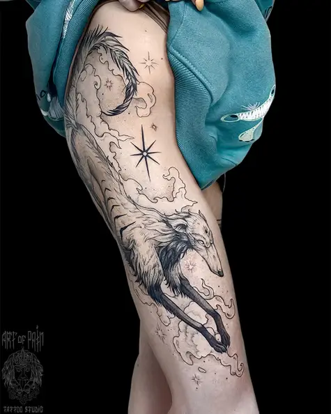 Татуировка женская графика на бедре кицунэ (Мария Котова) 8061