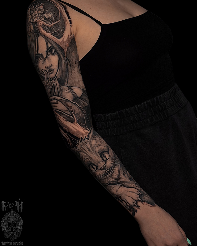 Татуировка женская нео-трад тату-рукав Алиса и Чеширский кот (Денис Марченко) 8072