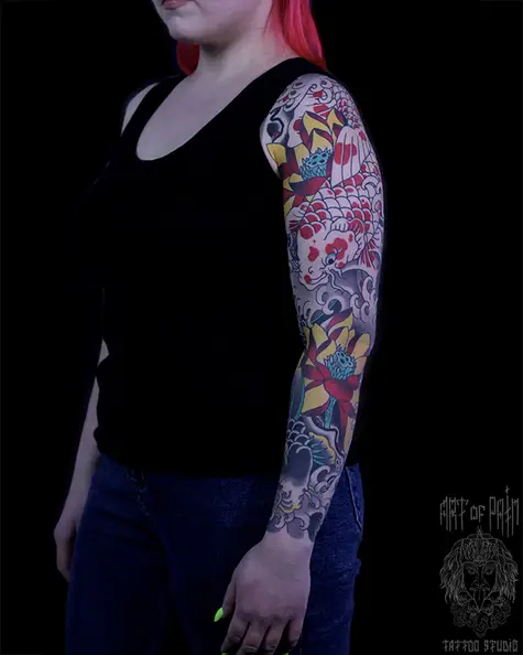 Татуировка женская япония тату-рукав карпы и лотосы 8106