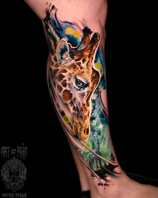 Татуировка женская реализм на голени жираф (Дмитрий Шейб) 8113