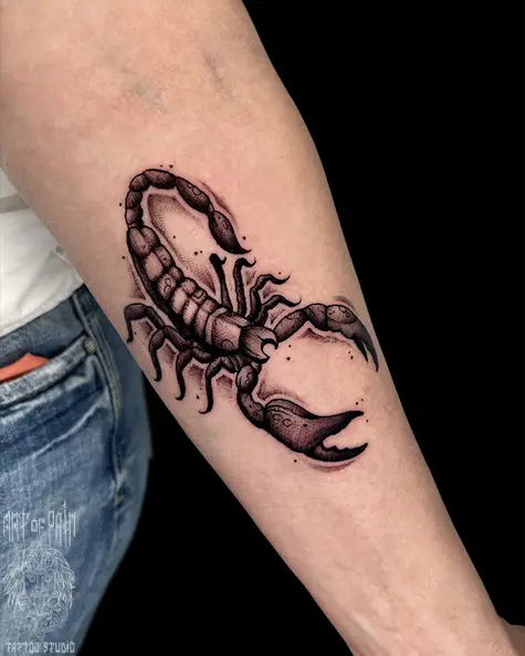 Татуировка женская графика на предплечье скорпион (Евгения Шмидт) 8157