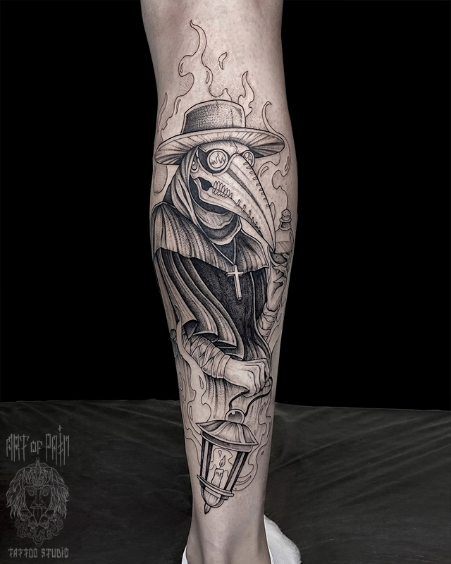Татуировка женская графика на голени чумной доктор (Мария Котова) 8200