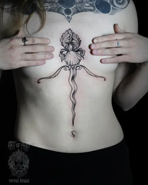 Татуировка женская графика на животе и груди ирис (Надежда Полякова) 8233