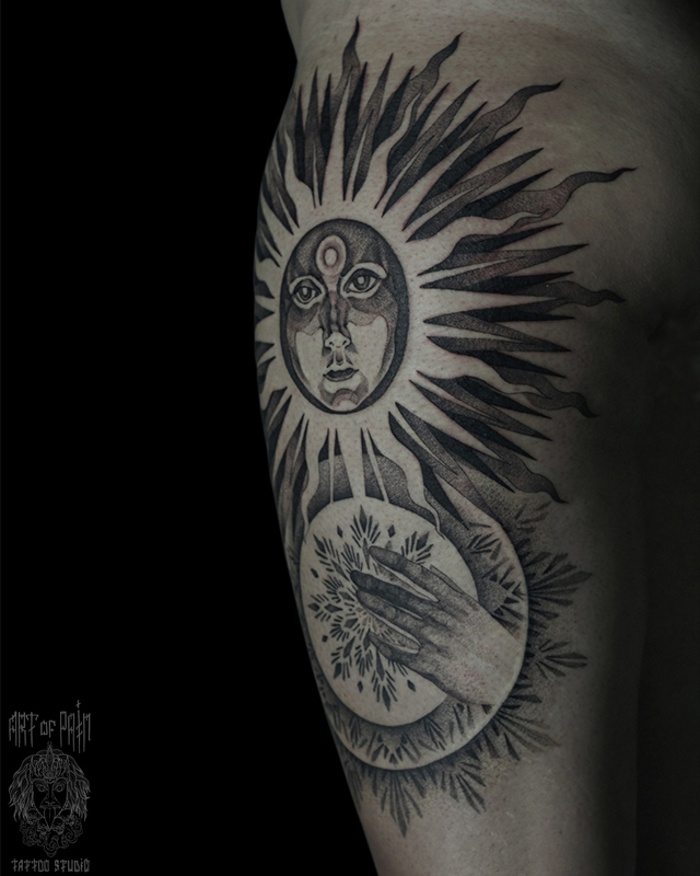 Татуировка женская графика и орнаментал на бедре солнце (Надежда Полякова) 8236