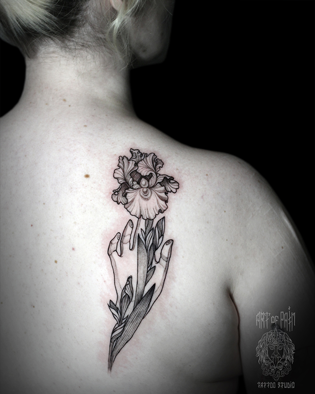 Татуировка женская графика на лопатке ирис (Надежда Полякова) 8238