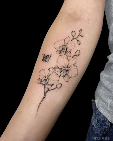 Татуировка женская графика на предплечье орхидея и шмель (Мария Котова) 8253