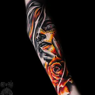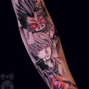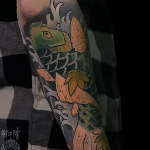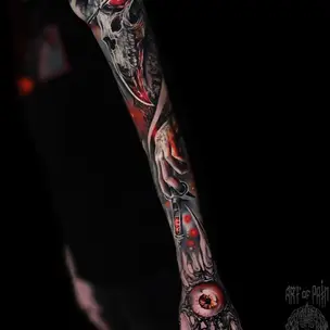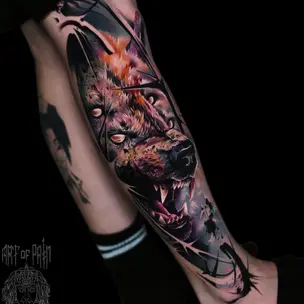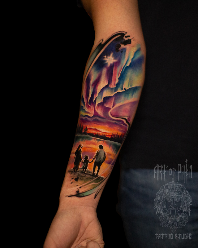 Татуировка женская цветной реализм на предплечье семья и северное сияние (Дмитрий Шейб) 8295